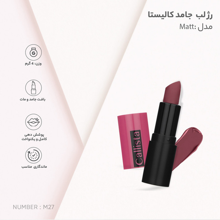 سایر مشخصات: - پایه رنگ: سرخابی تیره- نرم و روان- بافت جامد و مات- بدون ایجاد خشکی لب- پوشش دهی کامل و یکنواخت- ماندگاری مناسب- پخش آسان بر روی لب ها- رایحه دلپذیر