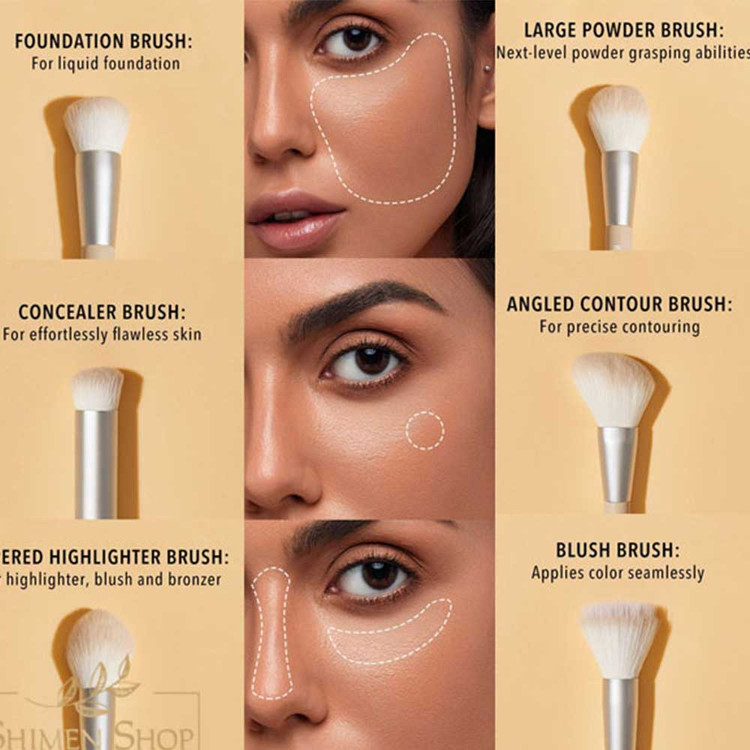 این مجموعه شامل براشهای زیر است که برای مراحل مختلف میکاپ طراحی شدهاند: